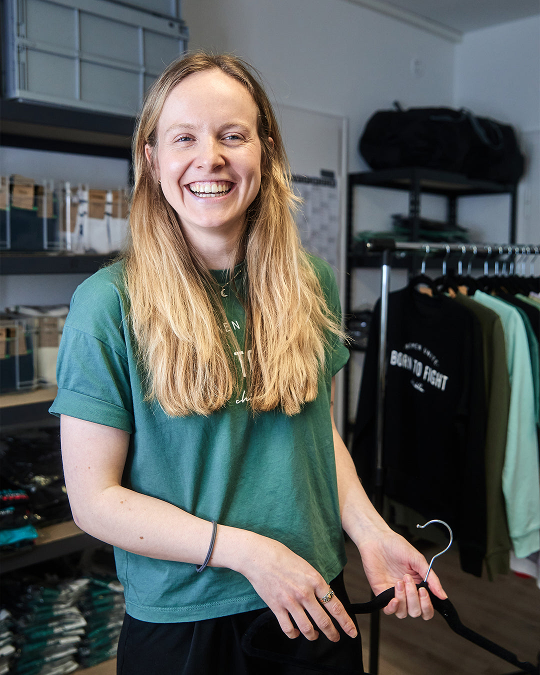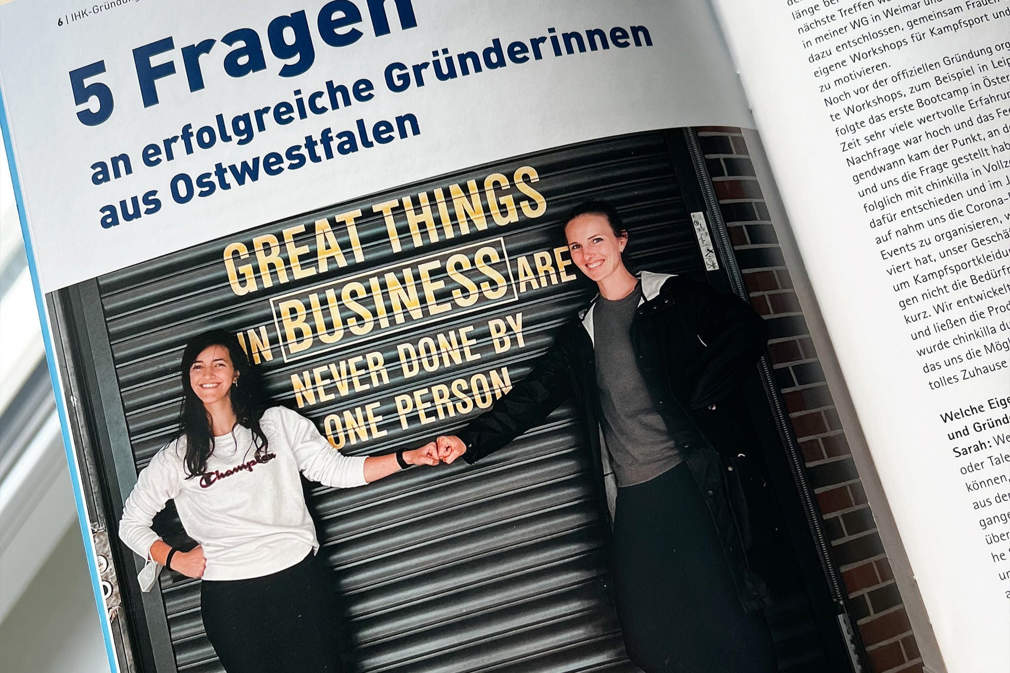 January 2020. Now there were 500 kilometers between us. We continued working on our ideas and visions via Skype. In early 2020, we officially founded our startup. After countless workshops and bootcamps, we started our next project in spring 2020: martial arts apparel for women, by women. And we quickly realized we’d need more support for this. Without hesitation, we applied for the NRW Founder’s Grant — and not only did we get it, but we also received an office space and lots of support from the startup center garage33 in Paderborn. By summer 2021, the time had come: chinkilla’s first fight gear line. We saw a gap in the market for apparel that wasn’t too pink, too short, or too tight — and we filled it. Produced in Europe! This was followed by countless photo shoots in cities all across Germany, allowing us to build a nationwide network of female martial artists and trainers. Not long after that, I decided to swap countless Deutsche Bahn tickets for an apartment in Paderborn. Cause we are stronger together. – Dani