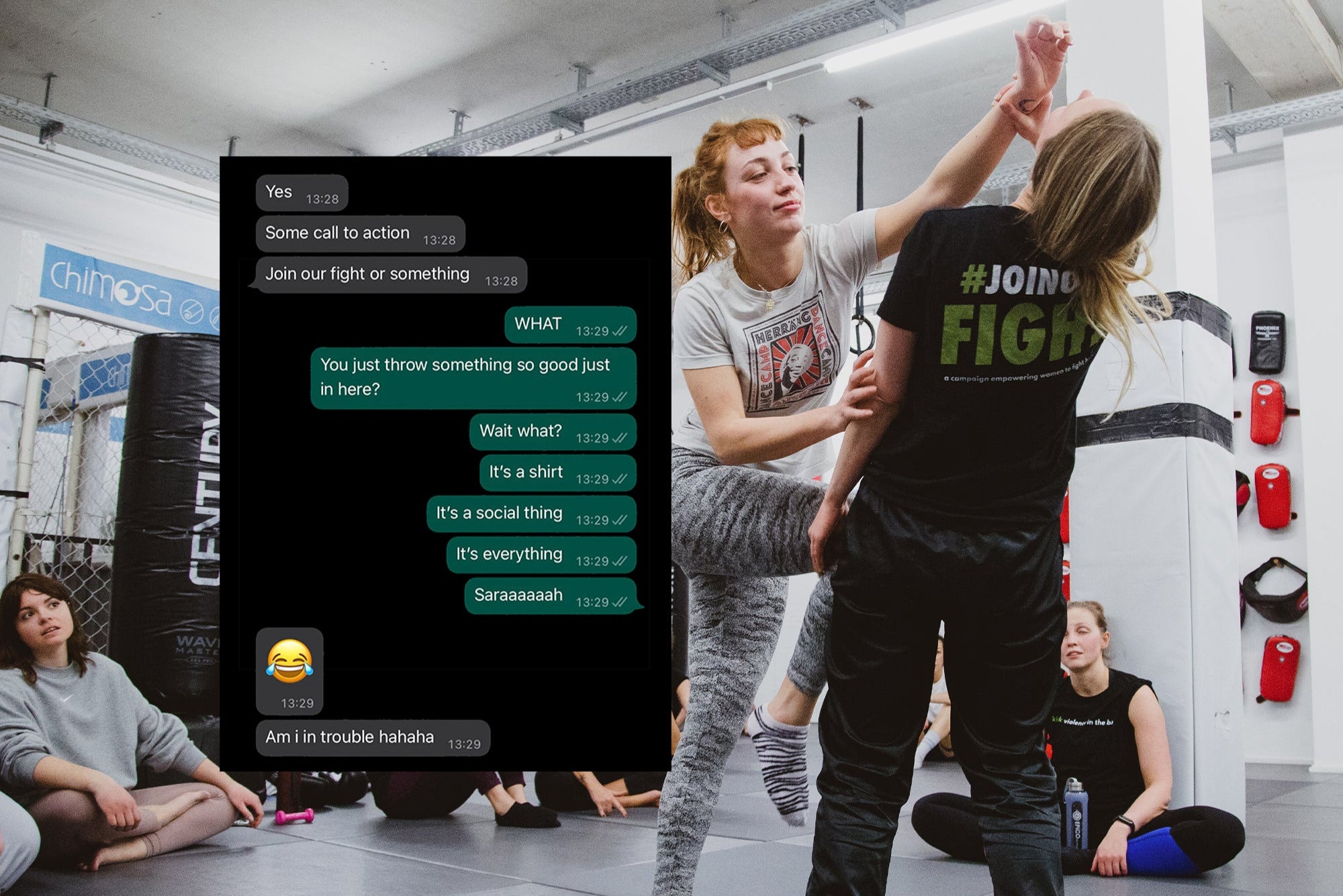March 2022. All our great ideas start with a text message. As did the #JoinOurFight,campaign. Something was missing in our content. I suggested a call toaction: “Join our fight or something.” That triggered a light switch in Dani's head, and what started as a discussion about ads turned into a whole social movement. On International Women’s Day 2022, a whopping 25 gyms across Germany answered the call to Join Our Fight, bringing free martial arts and self-defense classes to 800 women nationwide - all in the same evening. With it came media coverage and outreach from corporations and individuals: can you bring this to our location? It was a game changer, and our first taste of what scaling meant. The prospect of reaching more women and girls was both thrilling and terrifying. How do we turn these hundreds into thousands? And thousands into millions? We can’t say it here because it’s confidential. But we can tell you this: the chinkilla story continues. The next chapter is being written, and it’ll knock your socks off. – Sarah