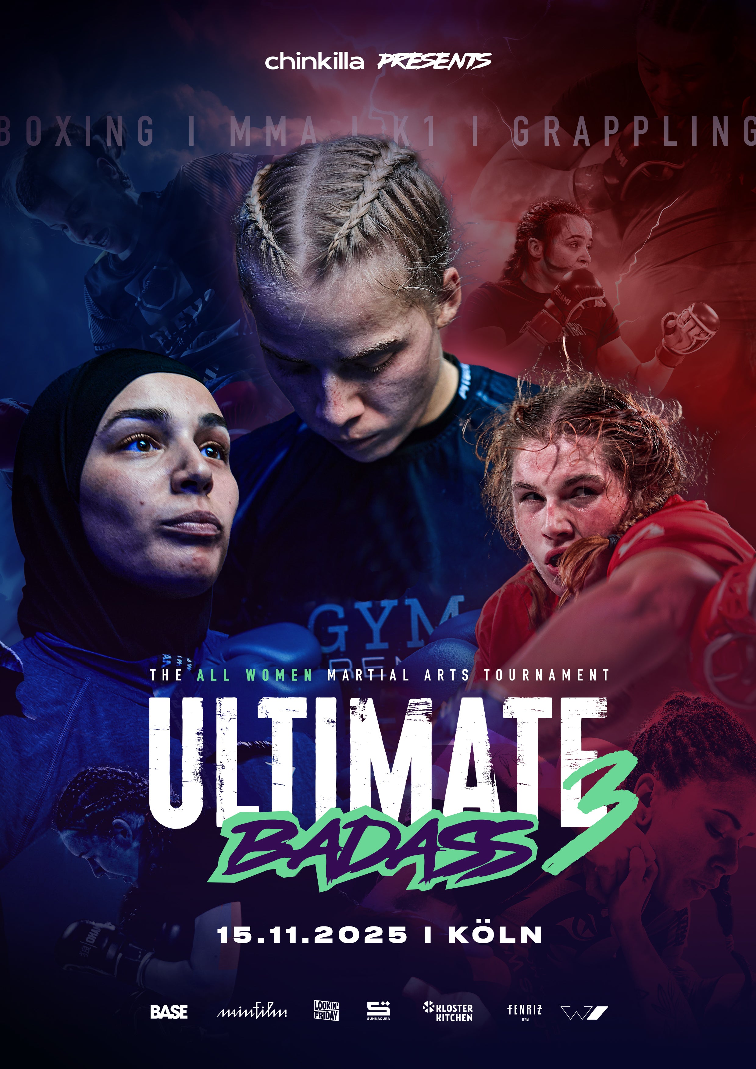 In der wunderschönen BASE in Köln-Mülheim steigt am 15. November das dritte Kapitel des All-Women-Martial Arts Wettkampf Formats. Im Cage stehen Frauen im Fokus – Newcomerinnen genauso wie erfahrene Kämpferinnen – und zeigen, was sie können: MMA, K1, Grappling, und Boxen in ihrer rohen, puren Form. Keine Show. Nur echte Skills, Wille und Kampfgeist. Denn klar ist: Der Anteil von Frauen im Kampfsport wächst, aber sie sind immer noch unterrepräsentiert. Wir ändern das. Ultimate Badass ist unsere Bühne für alle, die die Zukunft des Frauenkampfsports gestalten. Danke an unsere Unterstützer und Sponsoren, die das möglich machen: